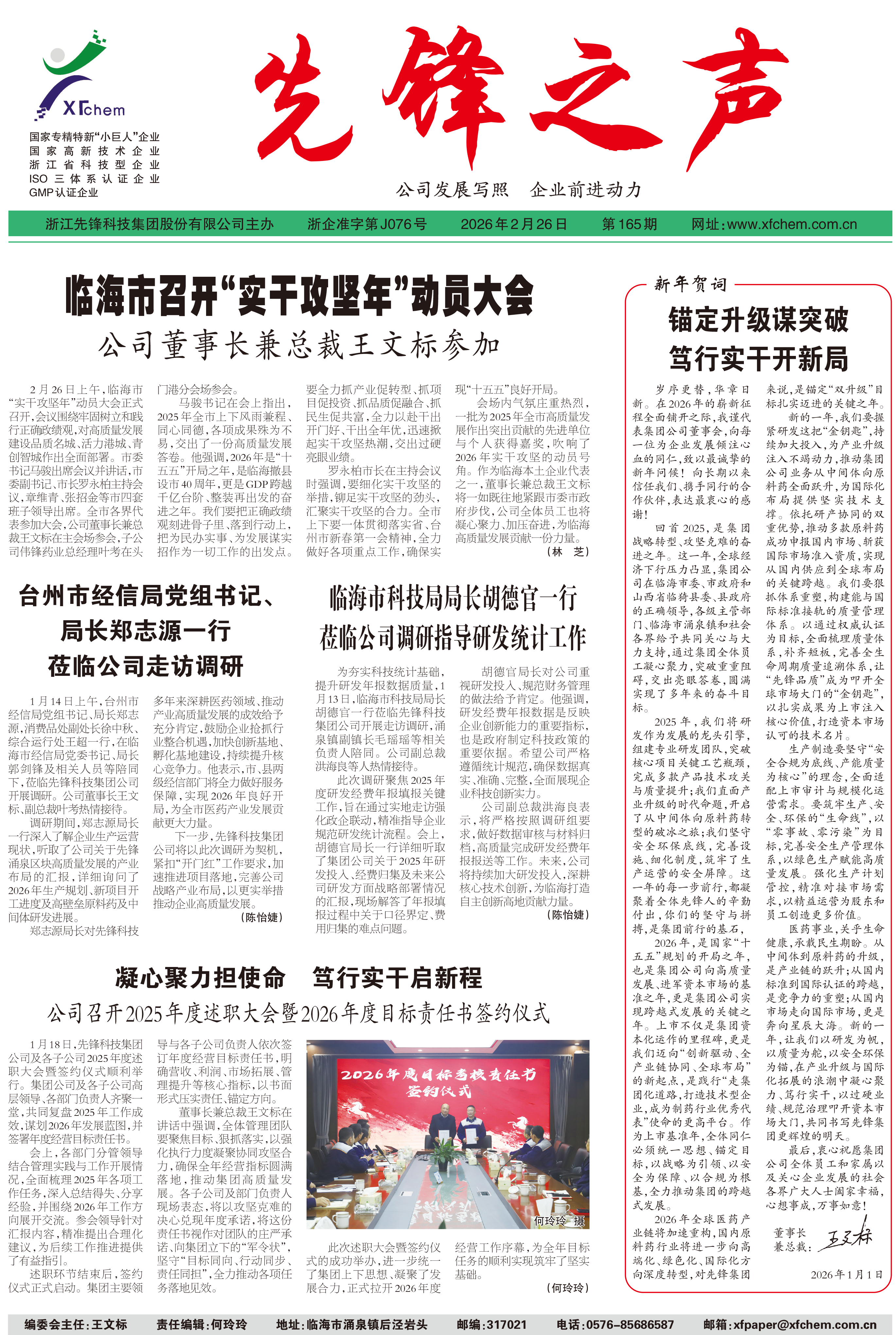 2月26日上午,临海市“实干攻坚年”动员大会正式召开,会议围绕牢固树立和践行正确政绩观,对高质量发展建设品质名城、活力港城、青创智城作出全面部署。市委书记马骏出席会议并讲话,市委副书记、市长罗永柏主持会议,章维青、张招金等市四套班子领导出席。全市各界代表参加大会,公司董事长兼总裁王文标在主会场参会,子公司伟锋药业总经理叶考在头门港分会场参会。